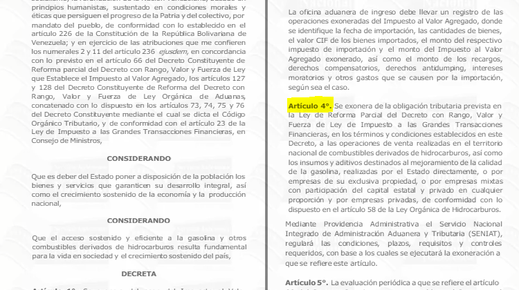 En Gaceta Oficial Nº 43.292, de fecha 9 de enero de 2026, fue publicado el Decreto N° 5.207, mediante el cual se exonera del pago del Impuesto al Valor Agregado, Impuesto de Importación y Tasa por Determinación del Régimen Aduanero, a las importaciones definitivas y las ventas realizadas en el territorio nacional de combustibles derivados de hidrocarburos, así como los insumos y aditivos destinados al mejoramiento de la calidad de la gasolina, realizadas por el Estado directamente, o por empresas de su exclusiva propiedad, o por empresas mixtas con participación del capital estatal y privado en cualquier proporción y por empresas privadas, de conformidad con lo dispuesto en el artículo 58 de la Ley Orgánica de Hidrocarburos.