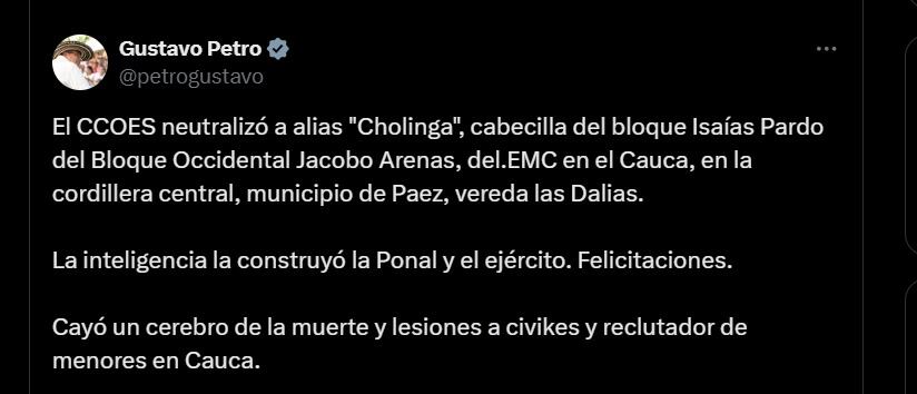 «El CCOES neutralizó a alias ‘Cholinga’, cabecilla del bloque Isaías Pardo del Bloque Occidental Jacobo Arenas, del EMC en el Cauca, en la cordillera central, municipio de Páez, vereda Las Dalias«, escribió Petro en su cuenta de X.