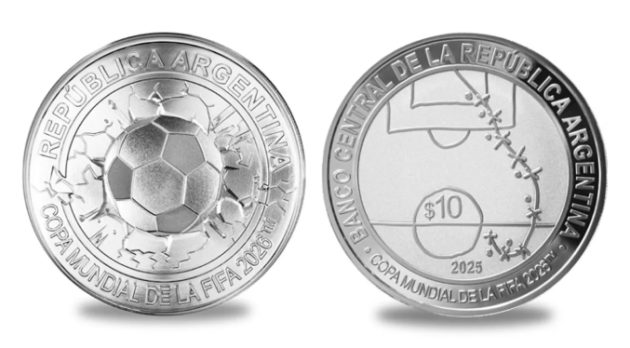 En su anverso, la pieza exhibe el grabado de un balón atravesando la superficie acompañado por las leyendas “República Argentina” y “Copa Mundial de la FIFA 2026”.