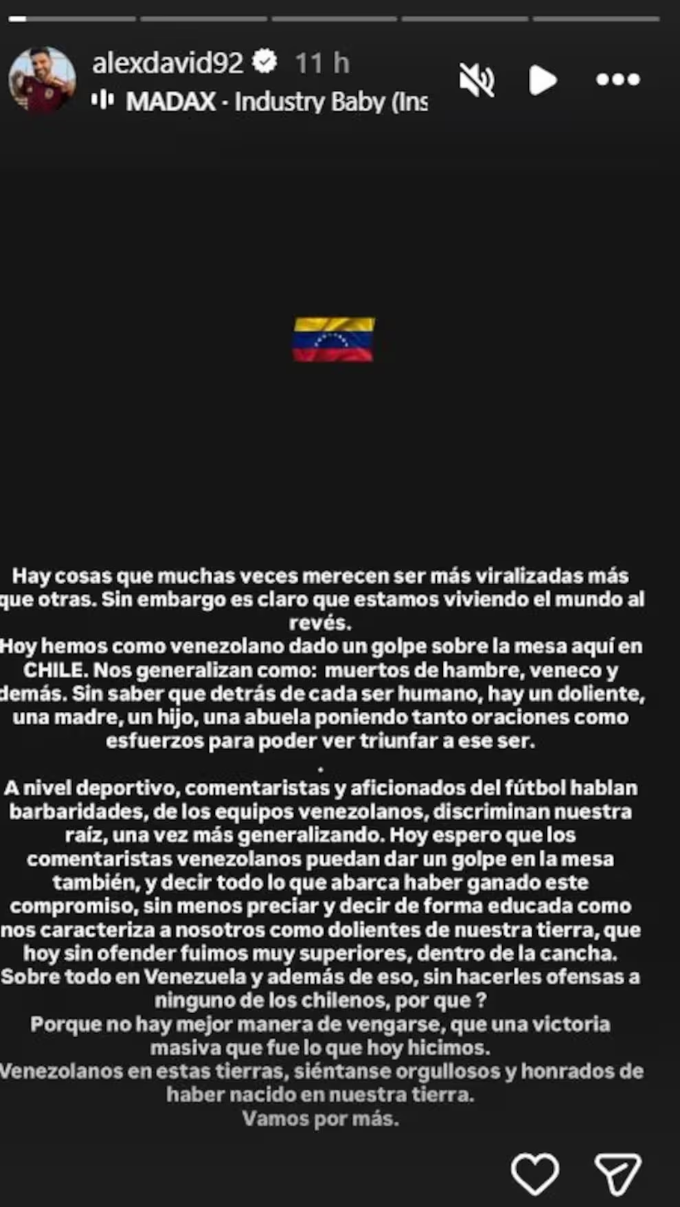 El jugador cerró su publicación destacando el resultado deportivo. “No hay mejor manera de vengarse que una victoria masiva que fue lo que hoy hicimos. Venezolanos en estas tierras, siéntanse orgullosos y honrados de haber nacido en nuestra tierra”, concluyó.