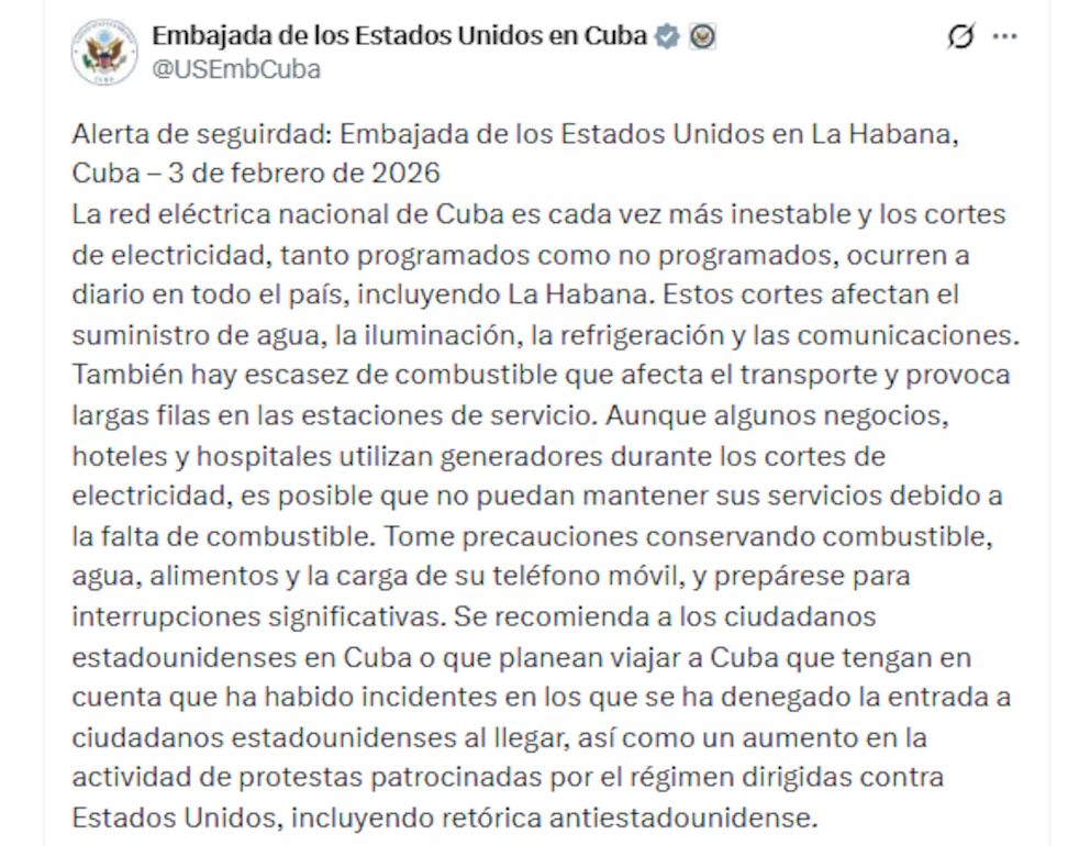 La embajada recomendó a los ciudadanos estadounidenses en Cuba, o a quienes planean viajar próximamente, que tomen precauciones ante la posibilidad de apagones prolongados y limitaciones en el acceso a suministros básicos.