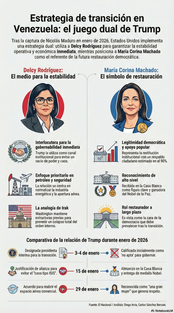El resultado es un mapa de poder en el que la Casa Blanca proyecta a Delcy Rodríguez como socia incómoda, pero necesaria para garantizar la estabilidad, mientras reduce a Machado al papel de interlocutora relevante pero no decisiva en el diseño de la transición, al menos en el corto plazo.