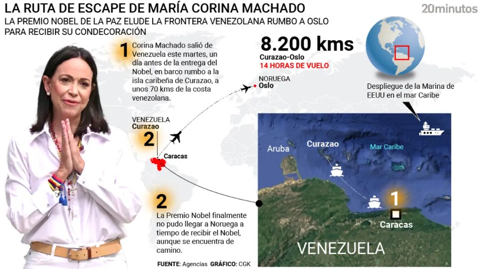 Sin embargo, Machado, de 58 años, llegó en la madrugada del jueves a la capital noruega a bordo de un avión privado que, según las páginas de rastreo de vuelos FlightRadar24 y FlightAware, partió esta mañana desde Curazao, una de las islas de los Países Bajos en el mar Caribe, situada solo 65 kilómetros de la costa de Venezuela.