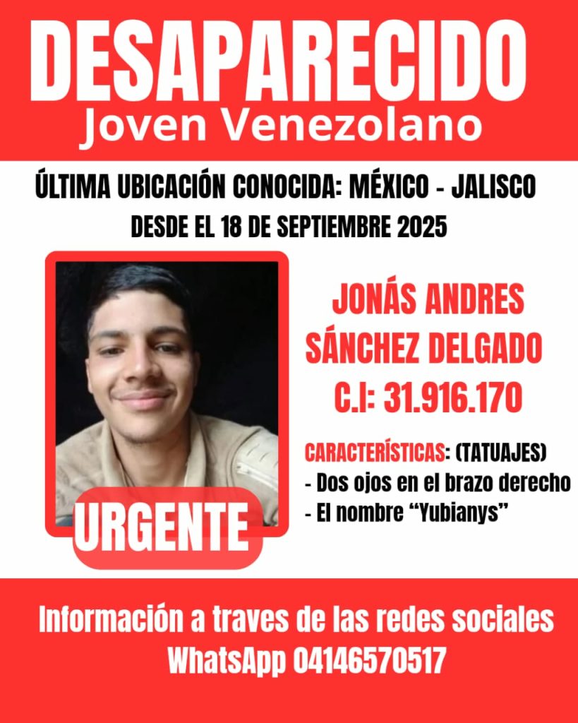 La familia y allegados de Jonas Andrés Sánchez Delgado, portador de la C.I: 31.916.170. Ciudadano venezolano oriundo de Ciudad Ojeda, estado Zulia, informan con profunda preocupación su desaparición en territorio mexicano