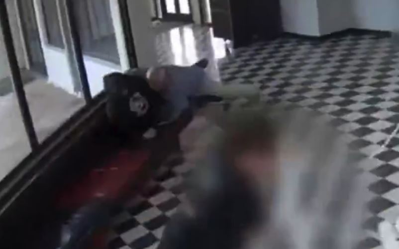 Imágenes de videovigilancia muestran a Kirk Moore abalanzándose sobre el agresor, inmovilizándolo sobre un sofá y desarmándolo, recibiendo una herida de bala en el proceso.