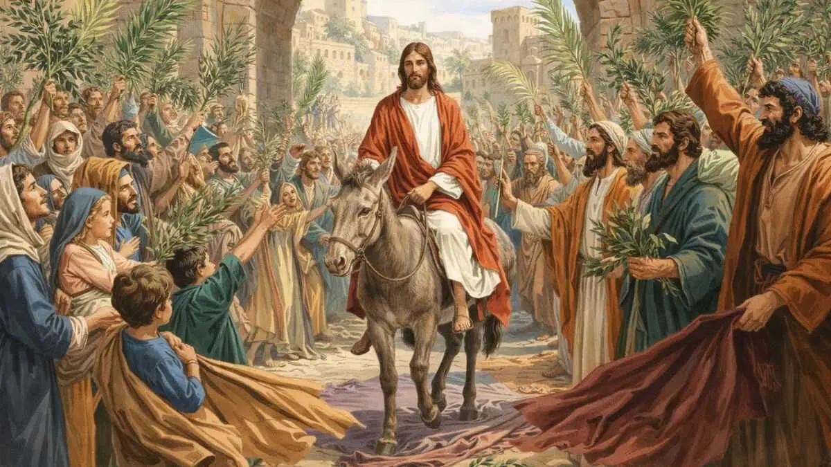 Este acontecimiento marca el inicio de la Semana Santa. Jesús entró montado en un asno —cumpliendo la profecía de Zacarías, aclamado por una multitud que extendía mantos y ramas de palma
