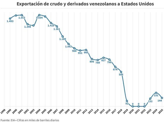 Venezuela exportó hacia Estados Unidos 144.900 barriles diarios de petróleo y derivados durante 2025, una caída de 38% en comparación con el año previo, de acuerdo con las cifras de la Agencia de Información Energética (EIA, por sus siglas en inglés).