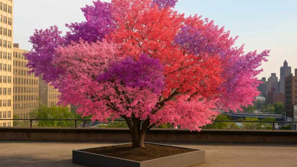 Creado por el artista Sam Van Aken, este ejemplar combina duraznos, ciruelas, nectarinas y almendras en un solo tronco como símbolo de biodiversidad.