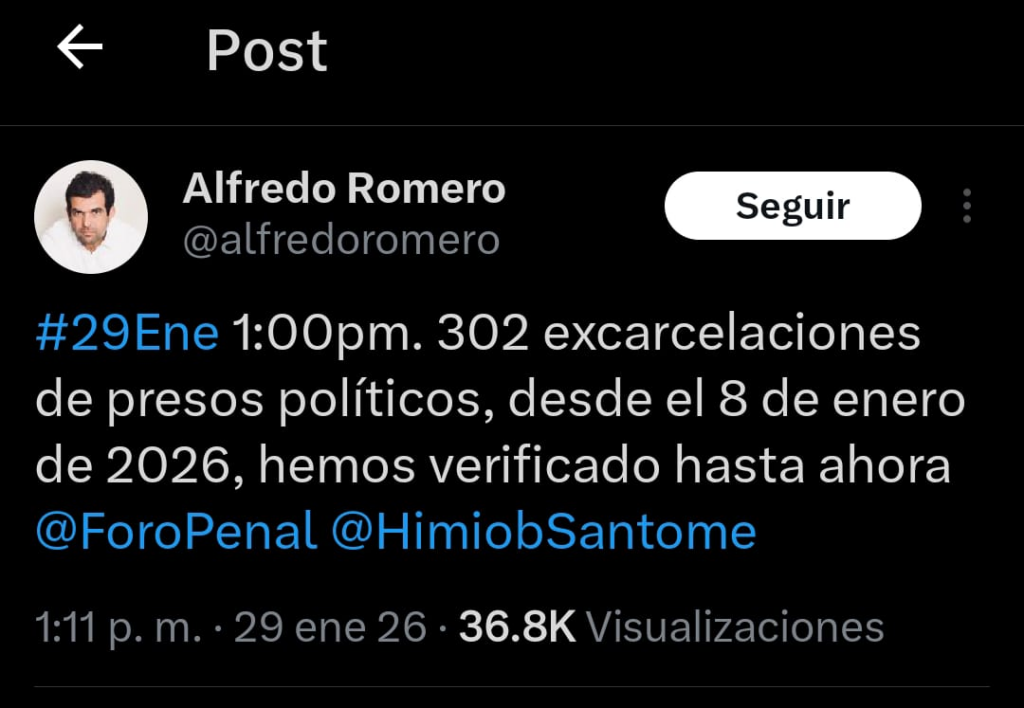 El presidente de Foro Penal, Alfredo Romero, precisó en su cuenta de X, que el conteo estaba calculado hasta la 1:00 p. m. del jueves, 29 de enero.