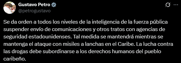 A través de su cuenta oficial en X, el mandatario colombiano ordenó a todos los niveles de la fuerza pública suspender el envío de comunicaciones y otros tratos con las agencias de seguridad estadounidenses. Petro fue enfático al señalar que esta medida se mantendrá «mientras se mantenga el ataque con misiles a lanchas en el Caribe».
