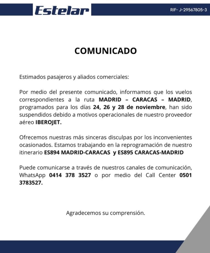 La aerolínea venezolana Estelar anunció este lunes la suspensión de sus vuelos correspondientes a la ruta Caracas-Madrid entre el 24 y el 28 de noviembre por, dijo, motivos operacionales de su proveedor aéreo Iberojet.