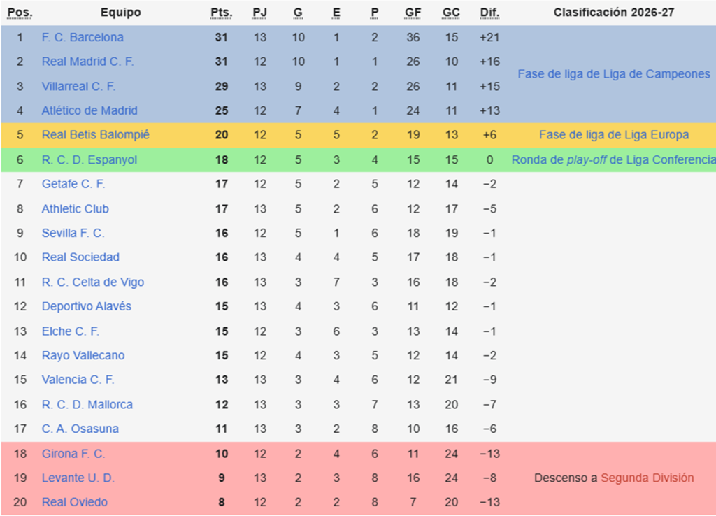 Con este resultado, el Barcelona alcanzó la cima de la Liga de España con 31 puntos y una mejor diferencia de gol que el Real Madrid, que disputará su partido de la fecha como visitante ante el Elche el domingo. El próximo compromiso para el elenco catalán será el martes 25/11, cuando se tenga que enfrentar al Chelsea por la Champions League. En cuanto al certamen local, en la fecha siguiente se medirá con el Alavés.