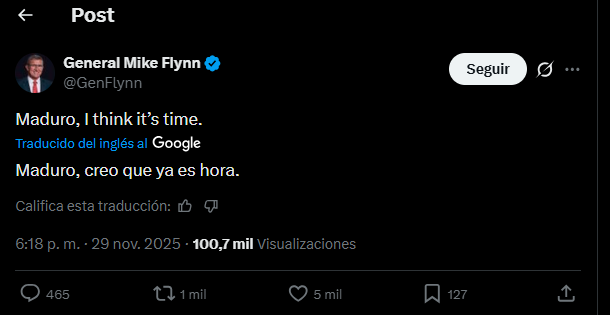 Desde su cuenta oficial en X (antes Twitter), el militar escribió: “Maduro, creo que ya es hora”, frase que encendió el debate político y las especulaciones sobre un posible desenlace militar de EEUU en Venezuela.