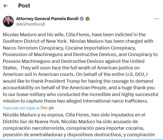 “Nicolás Maduro y su esposa, Cilia Flores, han sido imputados en el Distrito Sur de Nueva York. Nicolás Maduro ha sido acusado de conspiración narcoterrorista, conspiración para importar cocaína, posesión de ametralladoras y dispositivos destructivos, y conspiración para poseer ametralladoras y dispositivos destructivos contra Estados Unidos”, detalló la funcionaria en redes sociales.