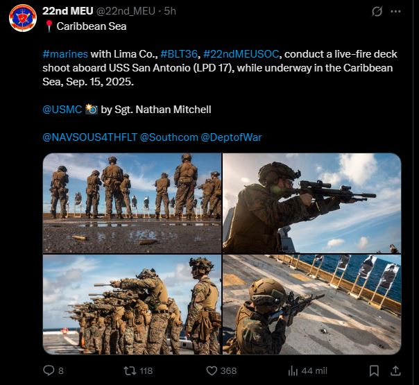 La 22.ª Unidad Expedicionaria de Infantería de Marina de Estados Unidos (22nd MEU) realizó un intenso entrenamiento con fuego real a bordo del buque de asalto anfibio USS San Antonio (LPD 17), destacando la preparación constante de las fuerzas estadounidenses.
