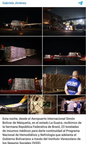 El día 08 se conoció la disposición de Brasil para enviar 40 toneladas de medicamentos para garantizar el tratamiento de hemodiálisis a 16 mil pacientes.