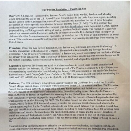 Los senadores demócratas estadunidenses Schiff, Kaine, Paul, Wyden, Sanders y Merkley, presentaron en nombre de su facción la resolución 83, que busca acabar con el uso de las Fuerzas Armadas de la nación norteamericana por parte de la administración del presidente Donald Trump para perpetrar ataques en el Caribe sin autorización del Congreso.