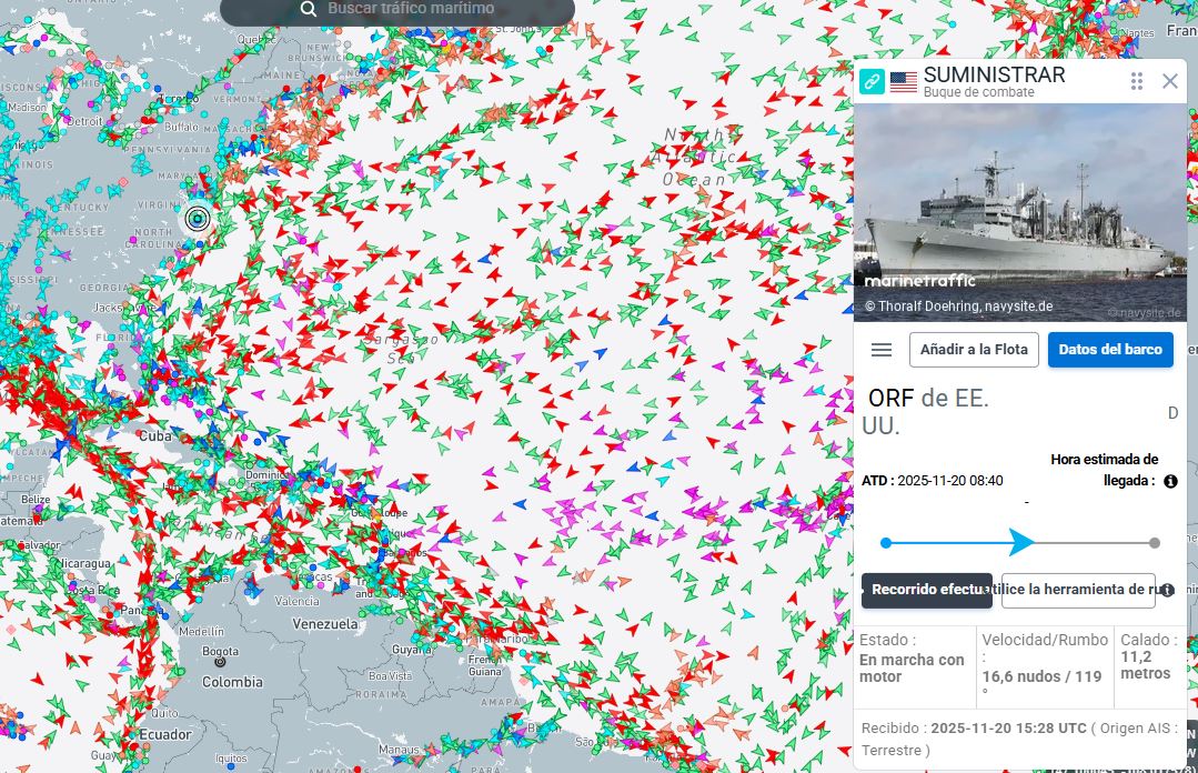 El buque de reabastecimiento rápido Usns Supply (T-AOE-6), perteneciente al «Comando de Transporte Marítimo Militar» de la US Navy, salió este viernes 21 de noviembre desde la base naval de Norfolk, Virginia (ORF), con rumbo al Mar Caribe.