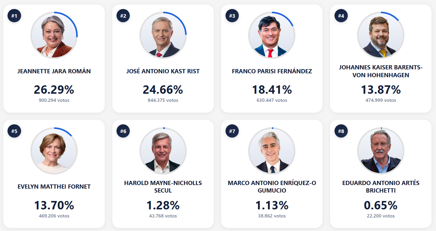 Según el cuarto cómputo revelado por la entidad (19:45 horas), con 27,38% de las mesas escrutadas, quienes lideran la carrera presidencial son Jeannette Jara (26,29%) y José Antonio Kast (24,66%).
