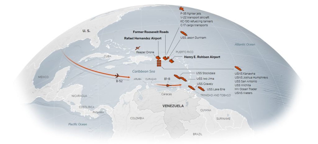 Reuters habló con tres oficiales militares estadounidenses y tres expertos marítimos, quienes afirmaron que las nuevas construcciones en Puerto Rico y las Islas Vírgenes apuntan a preparativos que podrían permitir al ejército estadounidense realizar operaciones dentro de Venezuela. El presidente venezolano, Nicolás Maduro, ha alegado repetidamente que Estados Unidos busca derrocarlo.