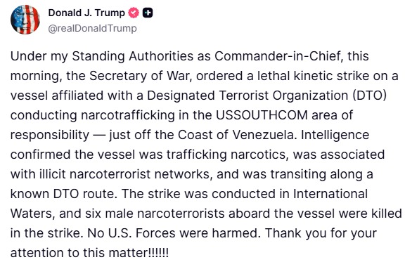«Esta mañana, el Secretario de Guerra ordenó un ataque cinético letal contra un barco afiliado a una Organización Terrorista Designada (OTD) que realiza narcotráfico en el área de responsabilidad del Comando Sur de los Estados Unidos frente a la costa de Venezuela», escribió en su red Truth Social.
