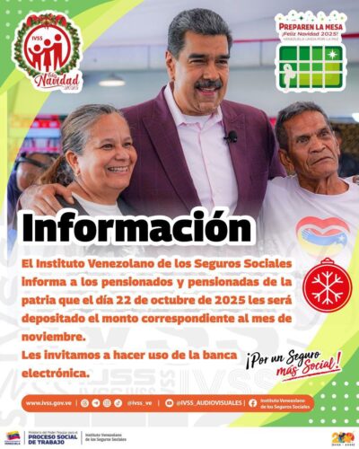 El Instituto Venezolano de los Seguros Sociales (IVSS) informó que este martes 22 de octubre se realizará el depósito del monto correspondiente a la pensión del mes de noviembre en las cuentas bancarias de los adultos mayores inscritos en el sistema.