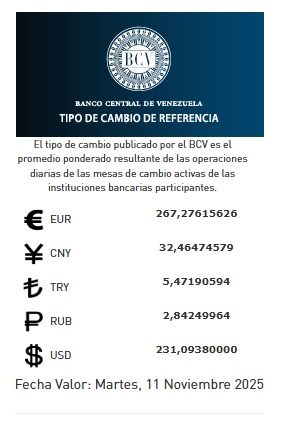 Vale destacar que el tipo de cambio publicado por el BCV es el promedio ponderado de las operaciones de las instituciones bancarias del país, al cierre de la jornada del lunes 10 de noviembre de 2025.