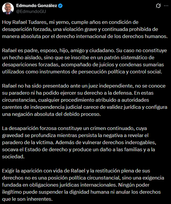 «Hoy Rafael Tudares, mi yerno, cumple años en condición de desaparición forzada, una violación grave y continuada prohibida de manera absoluta por el derecho internacional de los derechos humanos», denunció González.