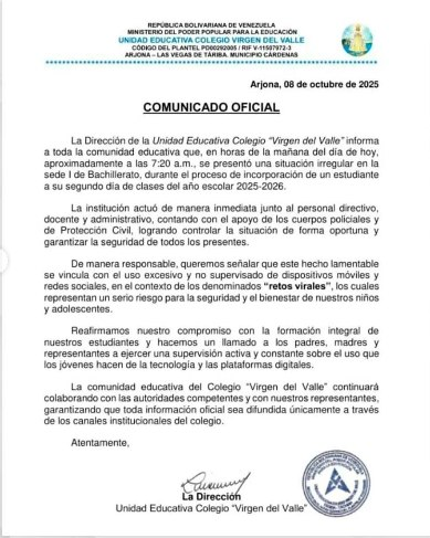 El Colegio Virgen del Valle emitió un comunicado oficial en el que asegura haber actuado con rapidez para controlar la situación y reafirma su compromiso con la formación integral de sus estudiantes. Asimismo, hizo un llamado urgente a padres y representantes para ejercer una supervisión constante sobre el uso de tecnologías por parte de menores de edad.