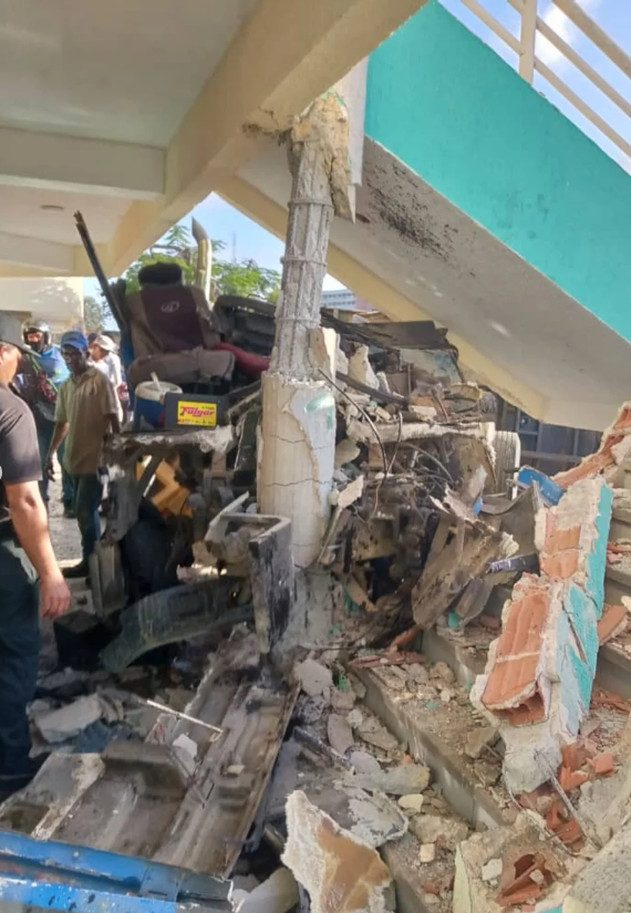 El camión involucrado en el accidente fue identificado como un Pegaso color azul con negro, sin placas, que quedó completamente destruido en su parte frontal. Los daños en la infraestructura del Centro Comercial Caribbean también fueron calificados como considerables, debido al colapso parcial de la escalera y afectaciones en la fachada principal.