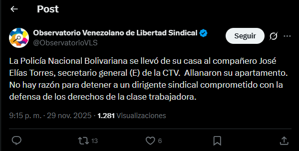 Una denuncia publicada en la cuenta oficial de X del Observatorio Venezolano de Libertad Sindical, encendió las alarmas en el entorno sindical venezolano, la noche del sábado 29 de noviembre.