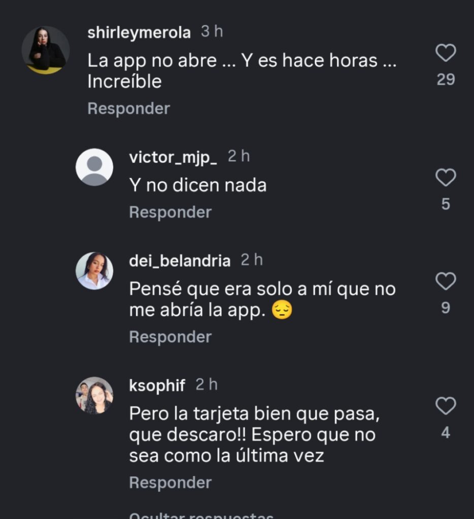 De acuerdo con lo expresado por los usuarios, la situación persiste desde hace varias horas, sin que se haya restablecido completamente el servicio. Se espera que en las próximas horas el banco ofrezca un pronunciamiento oficial y logre normalizar sus operaciones digitales.