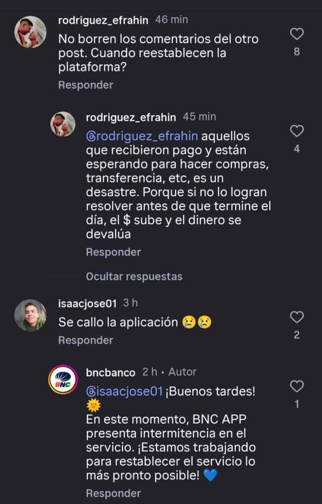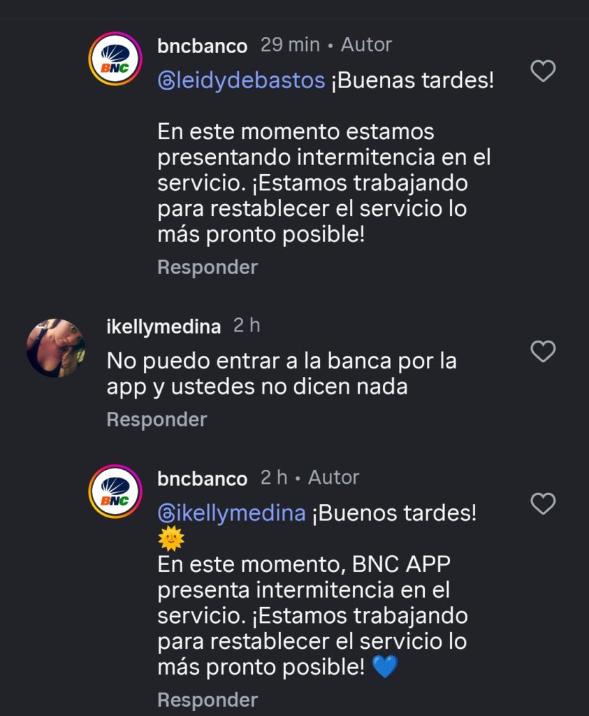 Hasta el momento, la entidad bancaria no ha emitido un comunicado oficial explicando las causas de la falla. Sin embargo, en las respuestas automatizadas dentro de sus propias plataformas digitales, se indica que el sistema presenta “intermitencia” y que el equipo técnico se encuentra trabajando para solventar el inconveniente.