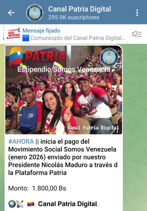 Este 19 de enero de 2026, comenzó el pago del estipendio del Movimiento Social «Somos Venezuela», correspondiente al mes en curso, a través del Carnet de la Patria.El monto dado, según precisó el Canal Patria Digital, es de Bs. 1.800 o US$ 5,22 al tipo de cambio vigente del Banco Central de Venezuela (BCV).