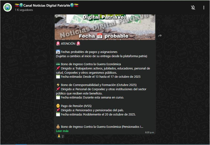 Por otra parte, el pago de pensión del IVSS podría efectuarse el 20 de octubre, seguido del Bono de Guerra Económica para pensionados, que será entregado posteriormente a través de la misma plataforma.
