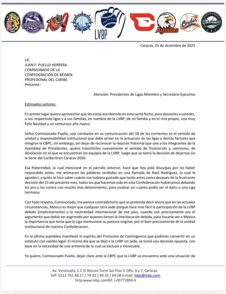 La exclusión de Venezuela como sede de la Serie del Caribe 2026 quedó formalmente expuesta en una carta enviada por la Liga Venezolana de Béisbol Profesional (LVBP) a la Confederación de Béisbol Profesional del Caribe (CBPC), en la que se detallan los argumentos, reclamos y preocupaciones institucionales tras la decisión adoptada el pasado 15 de diciembre.