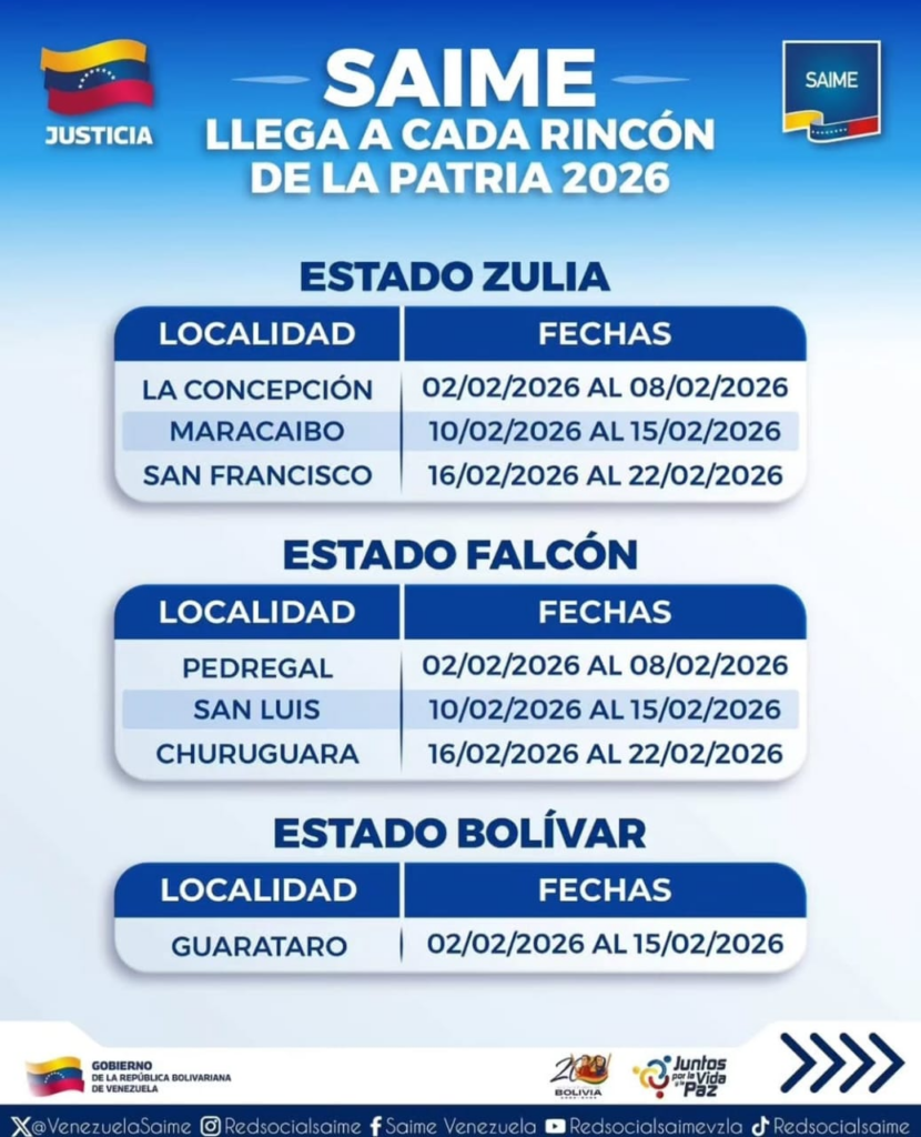 El Saime lleva a cabo además, el despliegue nacional de jornadas móviles de cedulación ‘sin cita’: “Saime Llega a Cada Rincón de la Patria 2026”.