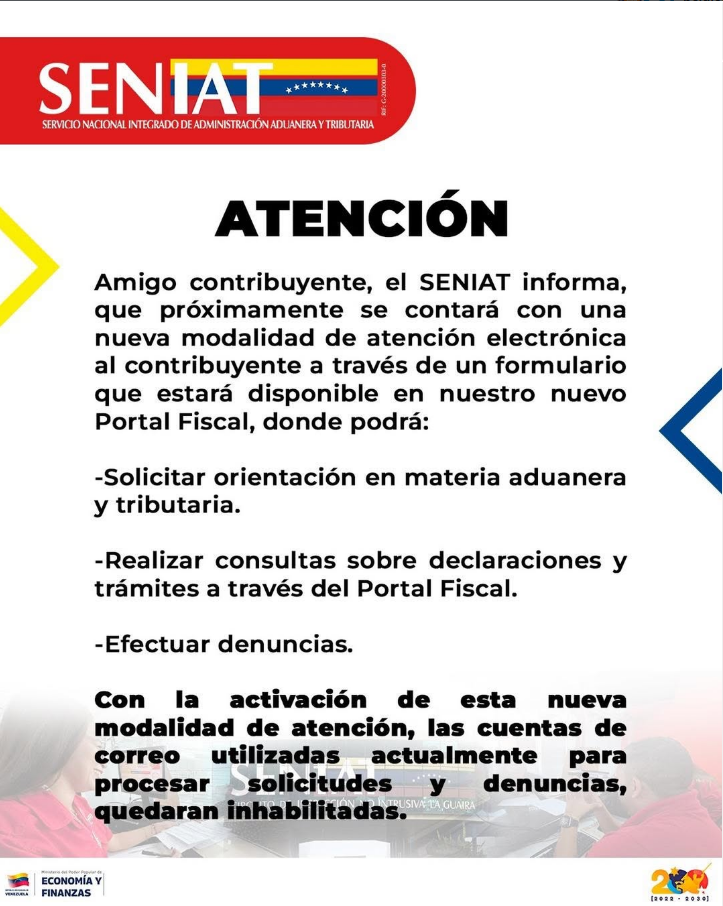 El Servicio Nacional Integrado de Administración Aduanera y Tributaria (SENIAT) informó que próximamente incorporará un nuevo formulario electrónico en el Portal Fiscal, con el objetivo de optimizar la gestión de trámites por parte de los contribuyentes.
