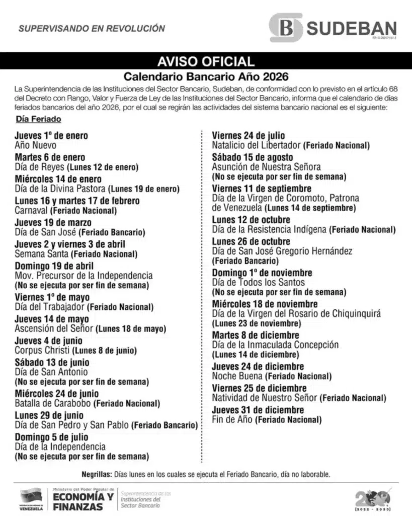 A través de un comunicado oficial, la Superintendencia de las Instituciones del Sector Bancario (Sudeban) informó a la colectividad que todas las instituciones del sector bancario nacional mantendrán sus operaciones con total normalidad durante los días: Lunes 30 de marzo, martes 31 de marzo y miércoles 01 de abril de 2026.
