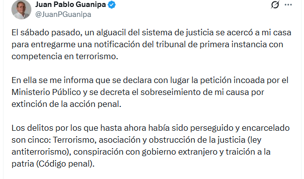A través de su cuenta oficial en la red social X, este 9 de marzo, el dirigente político Juan Pablo Guanipa confirmó haber recibido una notificación formal del Tribunal de Primera Instancia con Competencia en Terrorismo, en la que se decreta el sobreseimiento definitivo de su causa judicial.