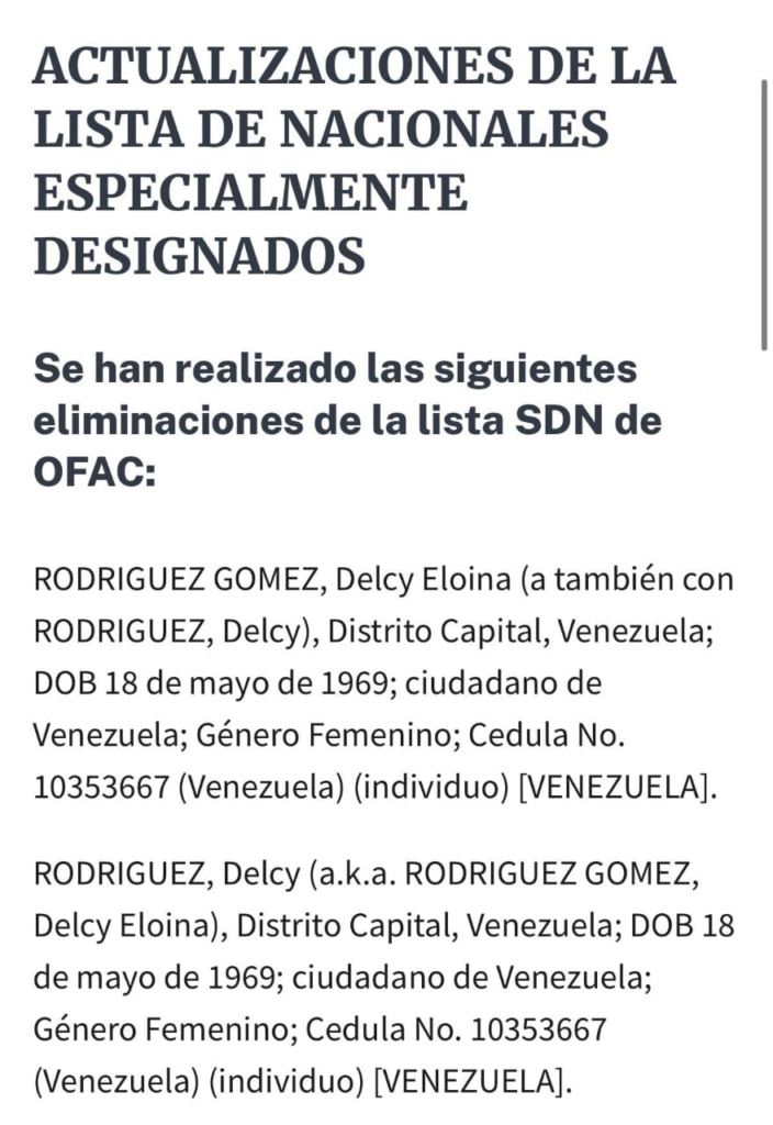 La medida fue oficializada este 1 de abril por el Departamento del Tesoro, a través de la Oficina de Control de Activos Extranjeros (OFAC), que eliminó a Rodríguez de la lista de Nacionales Especialmente Designados (SDN).