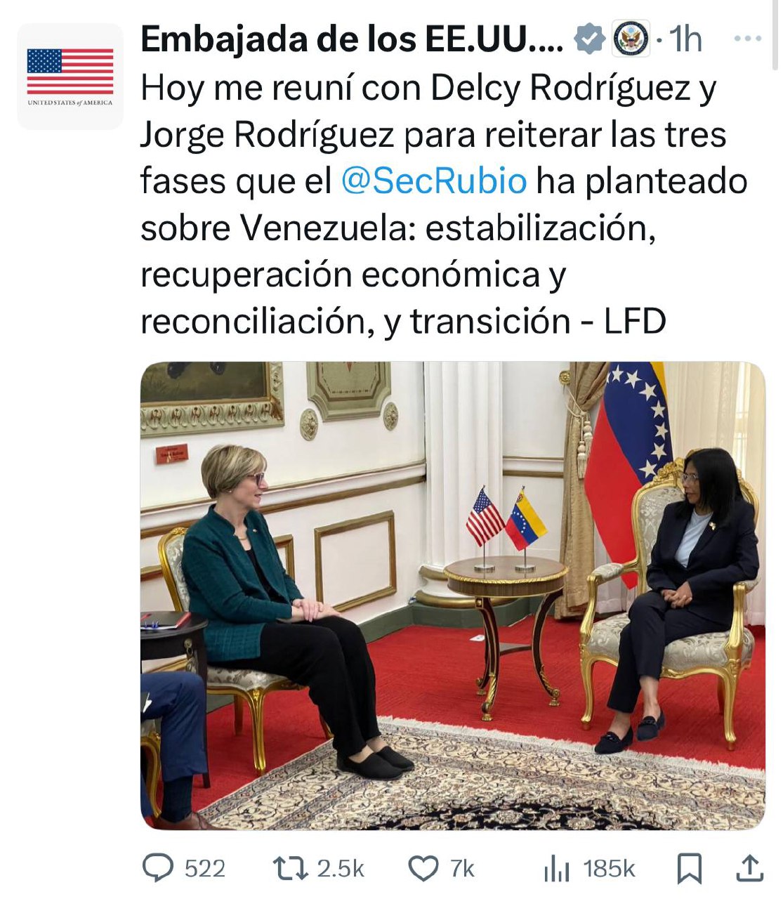 “Hoy me reuní con Delcy Rodríguez y Jorge Rodríguez para reiterar las tres fases que el @SecRubio ha planteado sobre Venezuela: estabilización, recuperación económica y reconciliación, y transición”, escribió Laura Dogu en redes sociales. De acuerdo con el plan de Marco Rubio, la primera fase incluiría las operaciones petroleras con empresas estadounidenses, mientras que, la segunda, la amnistía y liberación de opositores detenidos