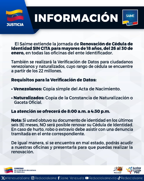 El Servicio Administrativo de Identificación, Migración y Extranjería (Saime) informó que desde este lunes 26 hasta el viernes 30 de enero, se llevará a cabo jornadas de cedulación sin cita en todo el país.