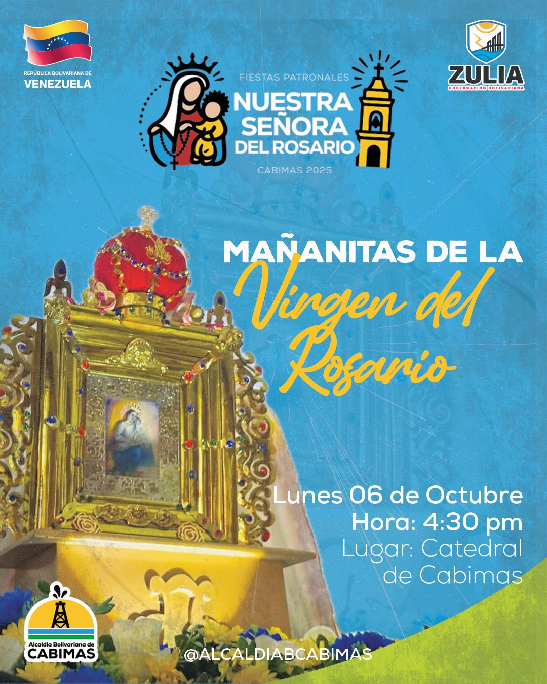 La Alcaldía Bolivariana de Cabimas, Catedral de Cabimas y Diócesis invitan a la colectividad a asistir y participar de tan importante festividad a partir de las 4:30 de la tarde.