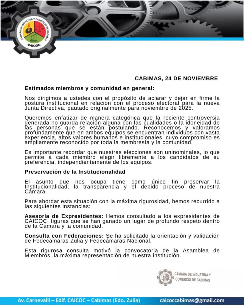 El comunicado, ratificó además que cualquier acto realizado este Lunes carece de validez legal ya que violenta las decisiones tomadas por la máxima instancia de la cámara de industria y comercio de la ciudad en esta caso la Asamblea General extraordinaria de miembros, la cual habría decidido reiniciar el proceso electoral interno de la ciudad y la nulidad de la elección de la actual comisión electoral presidida por Nordalys Villalobos.