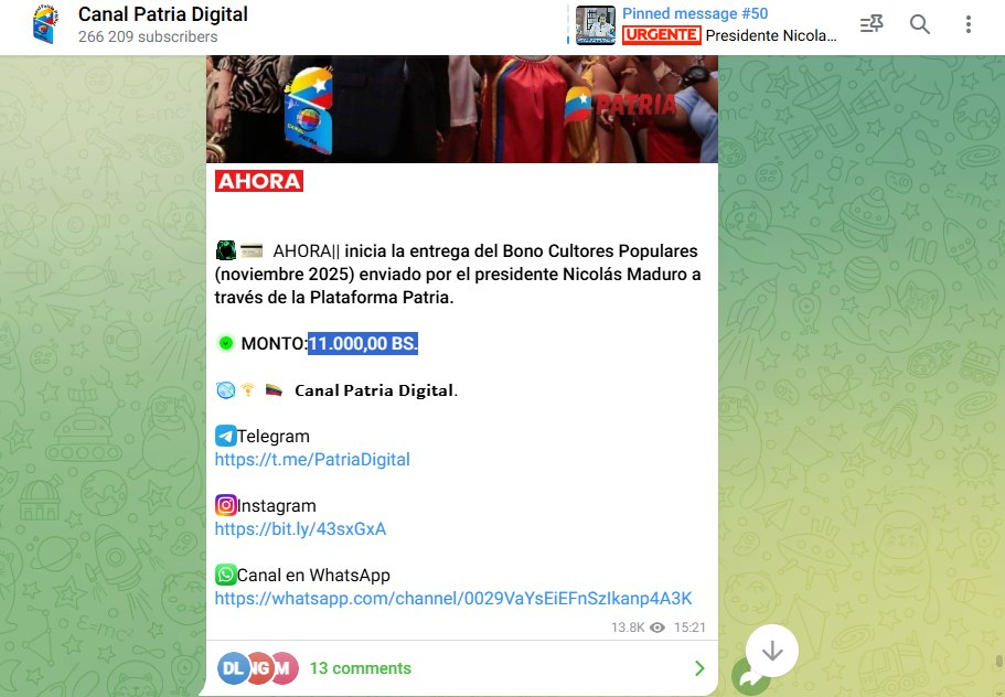 La Plataforma Patria inició la entrega del bono Cultores Populares, dirigido a las personas que estén registrados en el Ministerio del Poder Popular, la Cultura.