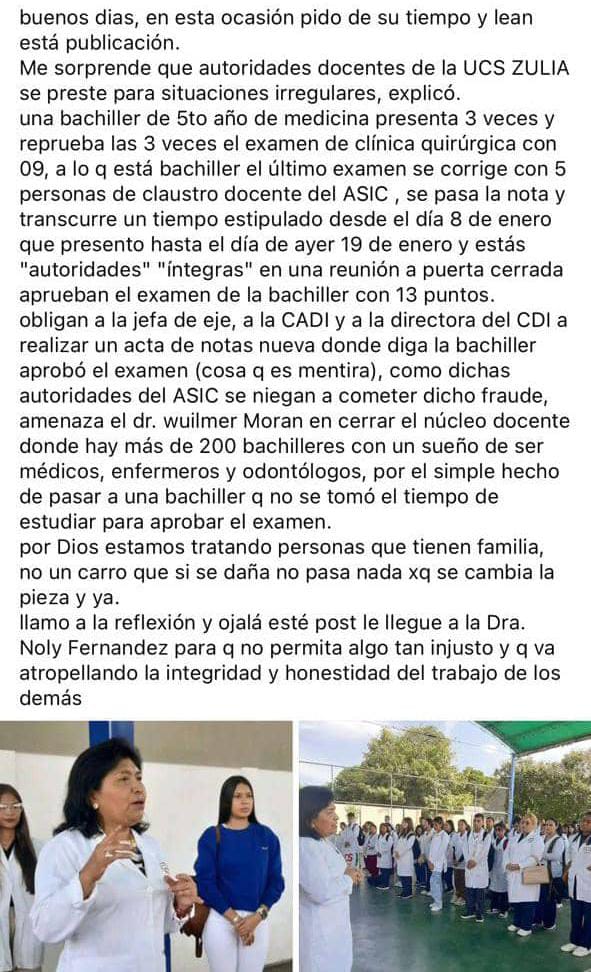 Sin embargo, la denuncia señala que familiares de la estudiante involucrada habrían acudido a instancias administrativas en la ciudad de Maracaibo para gestionar, mediante presuntos sobornos, una orden que obligue a su aprobación inmediata y posterior promoción al 6to año de la carrera.