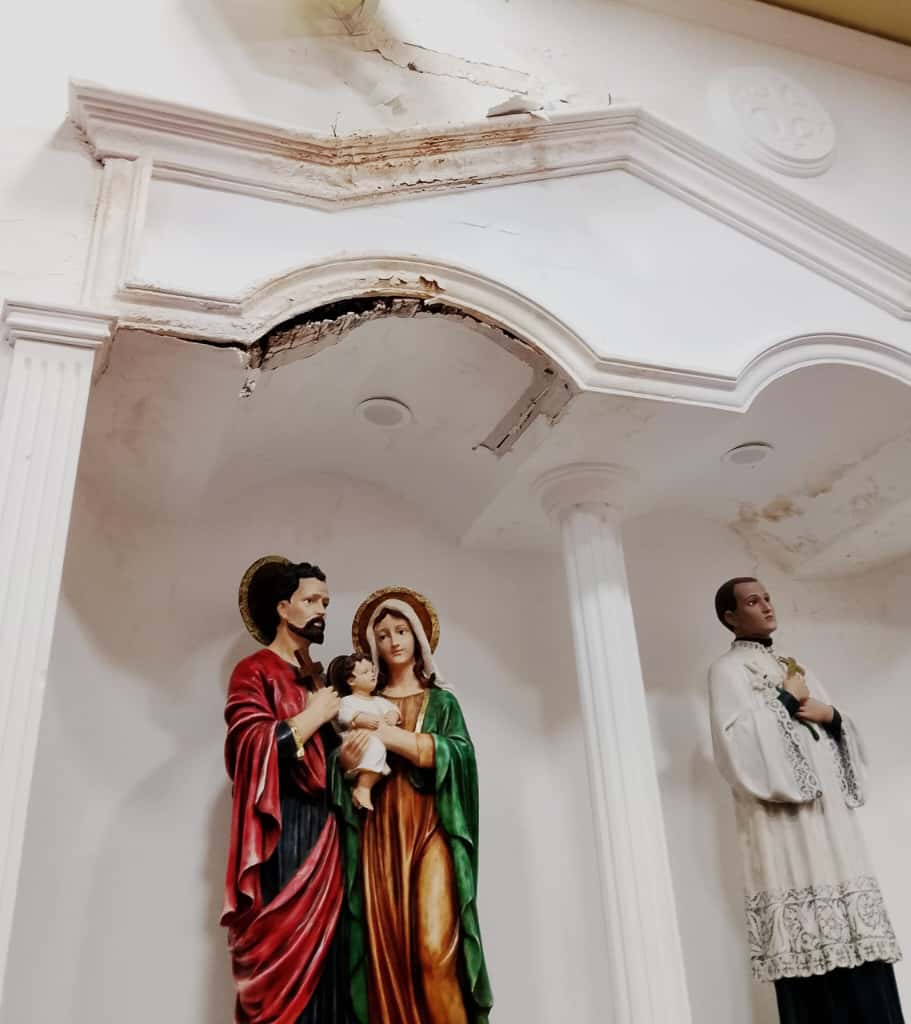 «La iglesia se llueve. Hay ocasiones, incluso, en las que se ha tenido que posponer el inicio de la Eucaristía, porque en su mayoría está anegada. Esto ha deteriorado las bancas, las molduras, todo el sistema eléctrico, de iluminación, que fue donado por unos hermanos, hace dos años. El estudio reveló que hay daños estructurales en la placa debido a esa humedad que se retiene «, detalla Yzzy sobre las diversas áreas de daño del templo, alcanzando también el piso.
