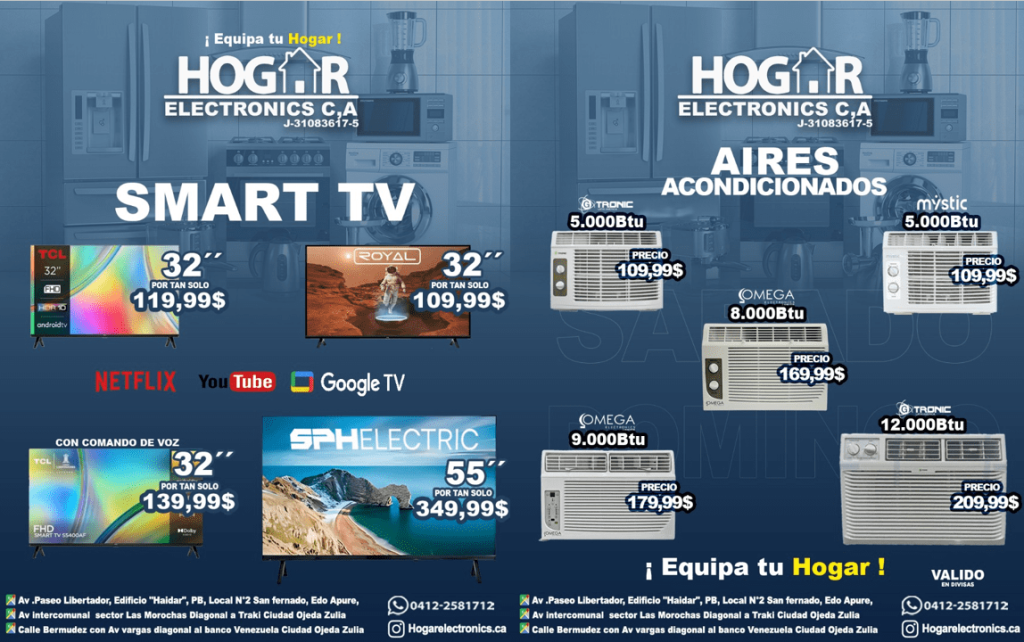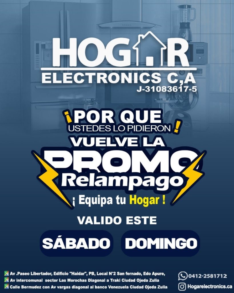 La cadena de tiendas Hogar Electronic anunció la continuidad de su temporada pre navideña con una segunda “Promo Relámpago” que se desarrollará este sábado 11 y domingo 12 de octubre en sus sedes de Ciudad Ojeda y San Fernando de Apure.