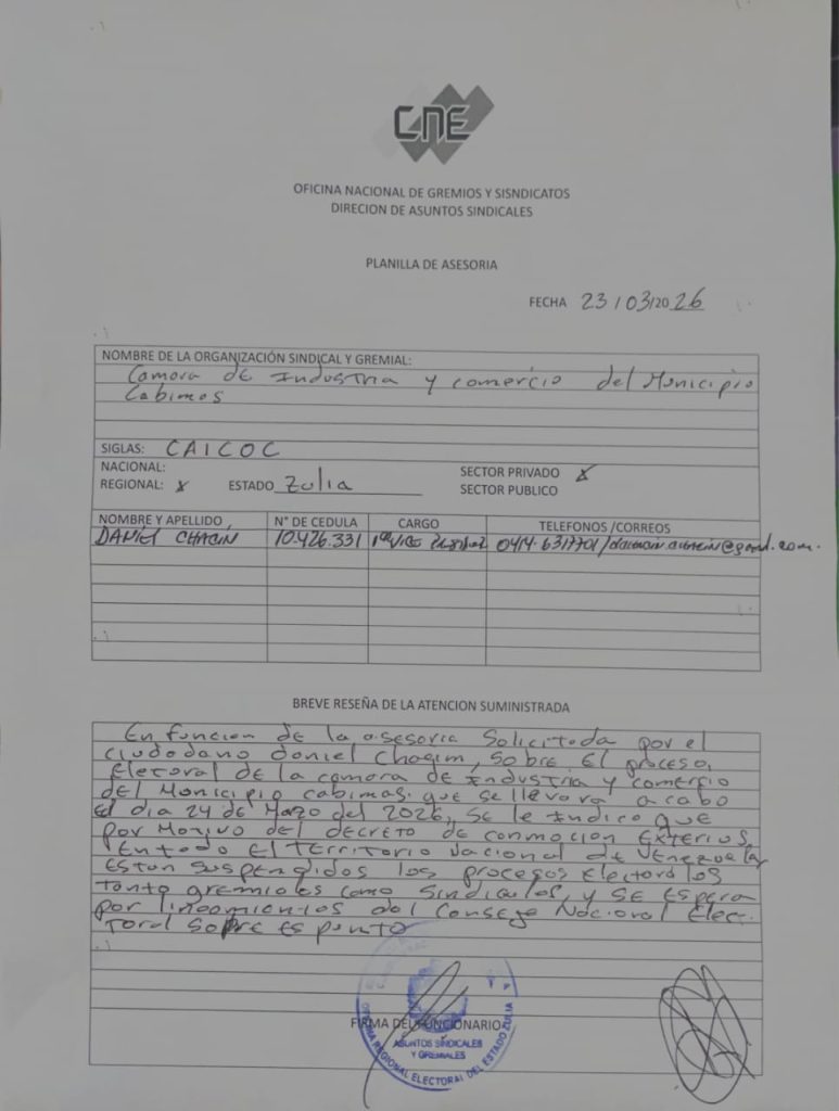 Este lunes 23 de marzo, el Ing. Armando Cedeño, presidente electo de la Cámara de Industria y Comercio de Cabimas (CAICOC), ratificó la invalidez del proceso electoral anunciado por la directiva que cesó funciones el pasado 31 de diciembre del 2025.
